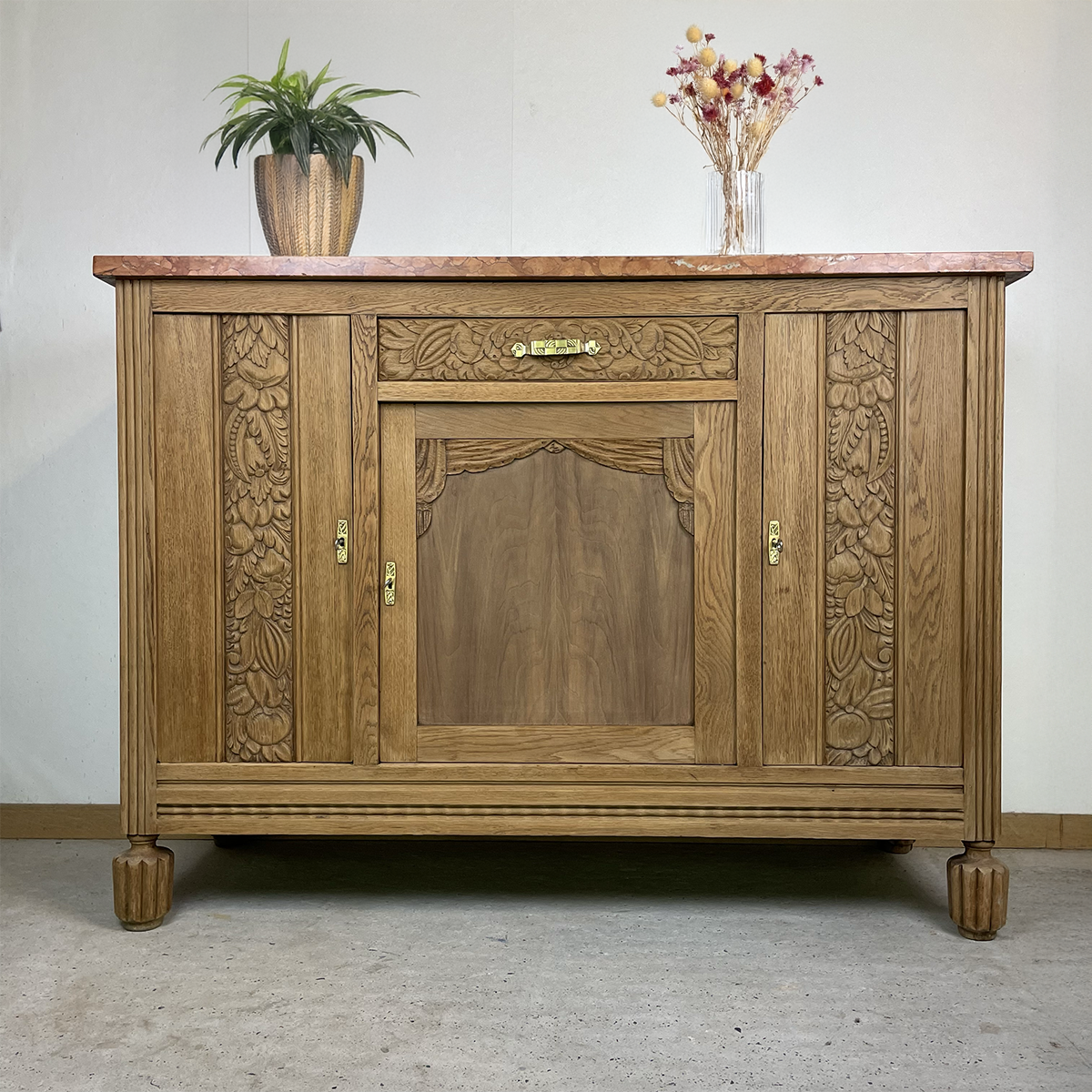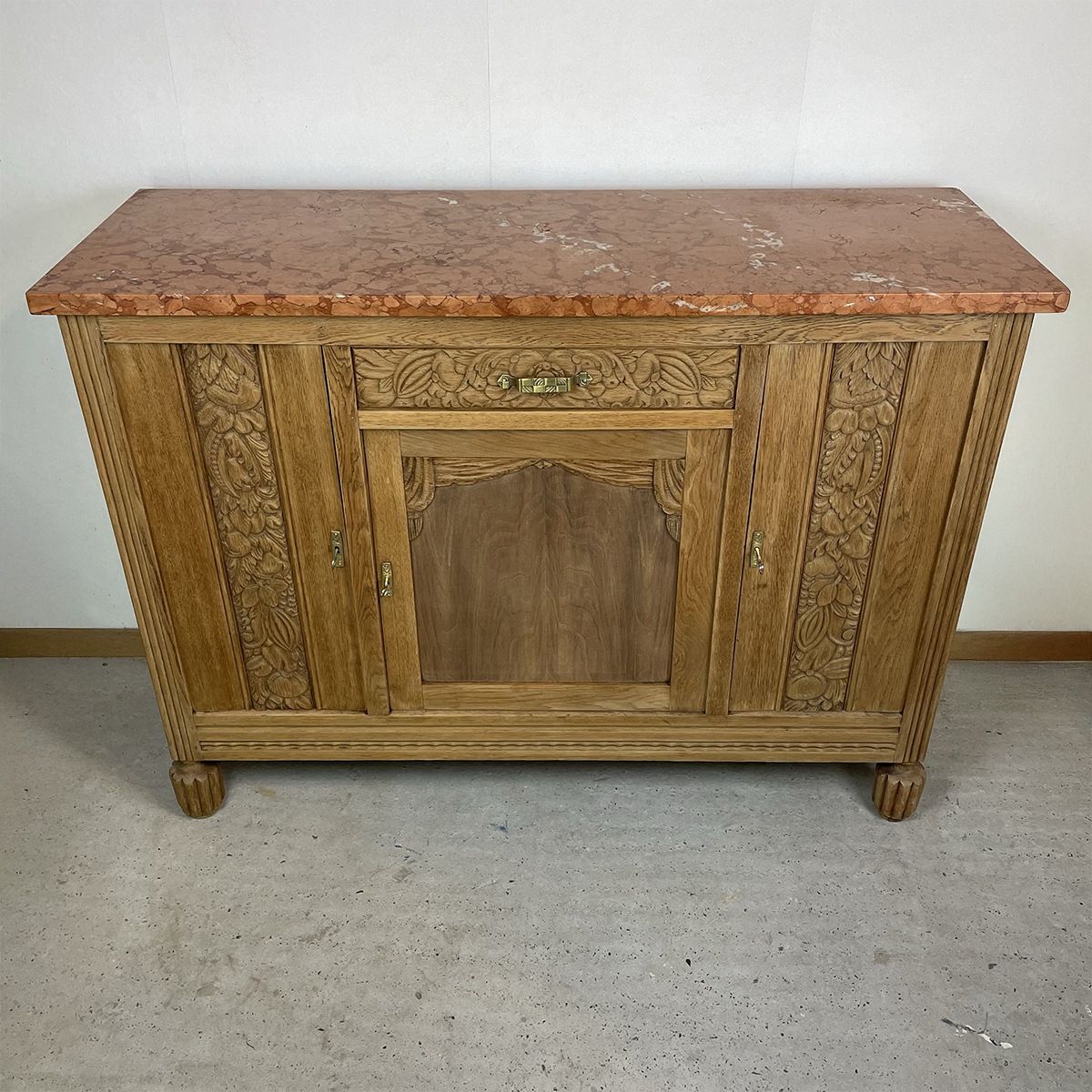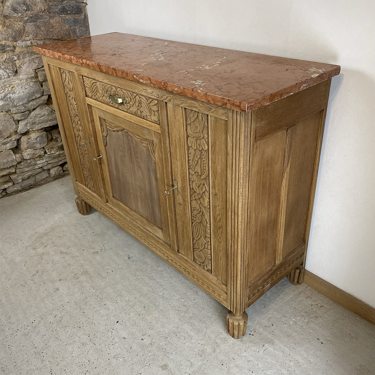 Ce buffet de type Art Déco se distingue par son plateau en marbre rouge et ses lignes élégantes. Entièrement restauré, il a retrouvé tout son charme d’époque.