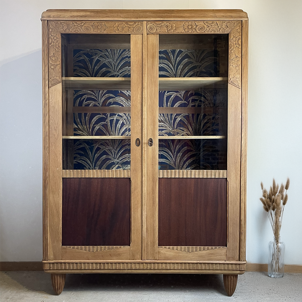Cette vitrine de type Art Déco a été entièrement rénovée pour révéler toute la beauté de ses essences de bois, entre acajou pommelé et palissandre.