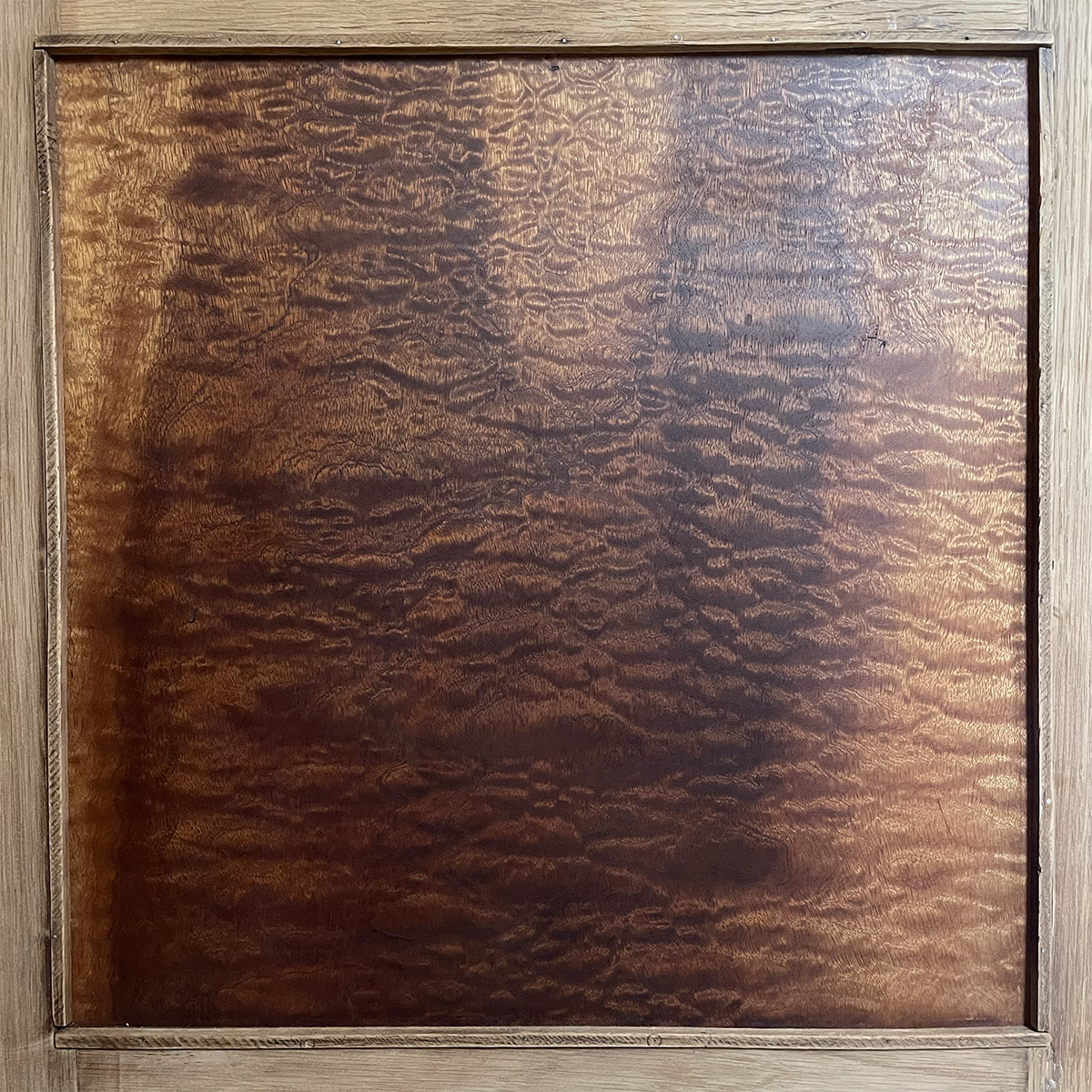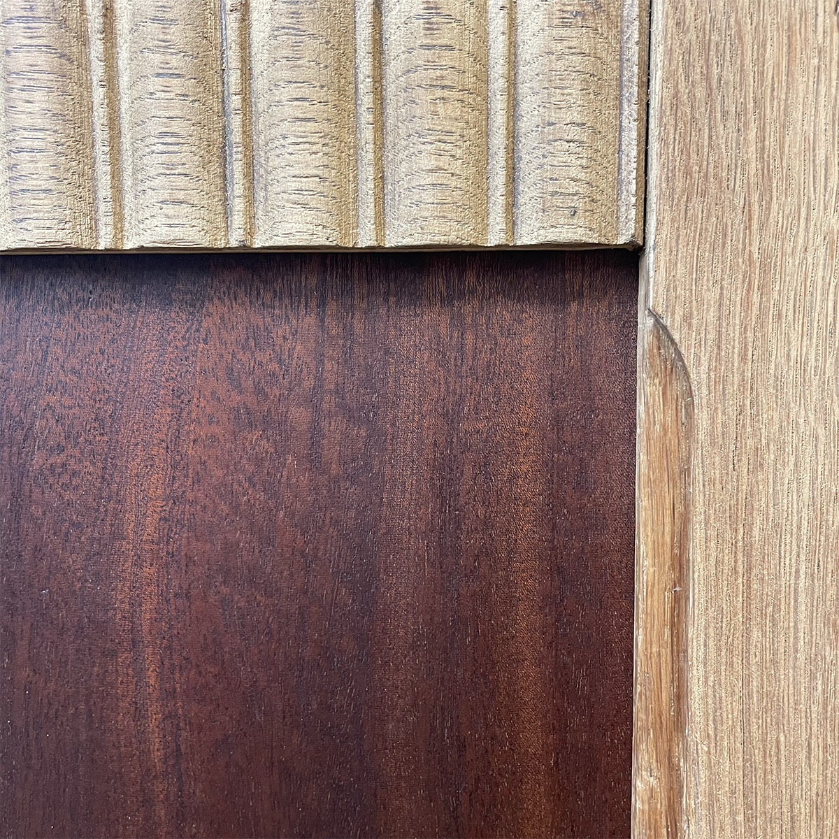 Cirage des panneaux de porte afin de faire ressortir le magnifique veinage et les couleurs de l’acajou pommelé (intérieur) et du palissandre (extérieur).